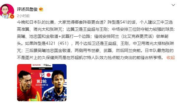 詹俊写道:“今晚和日本队的比赛,大家觉得哪套阵容更合适?”