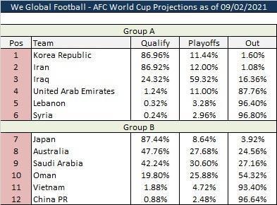 JRS直播网9月03日讯 外媒We Global Football今天计算了12强赛各队的出线概率,国足B组垫底。