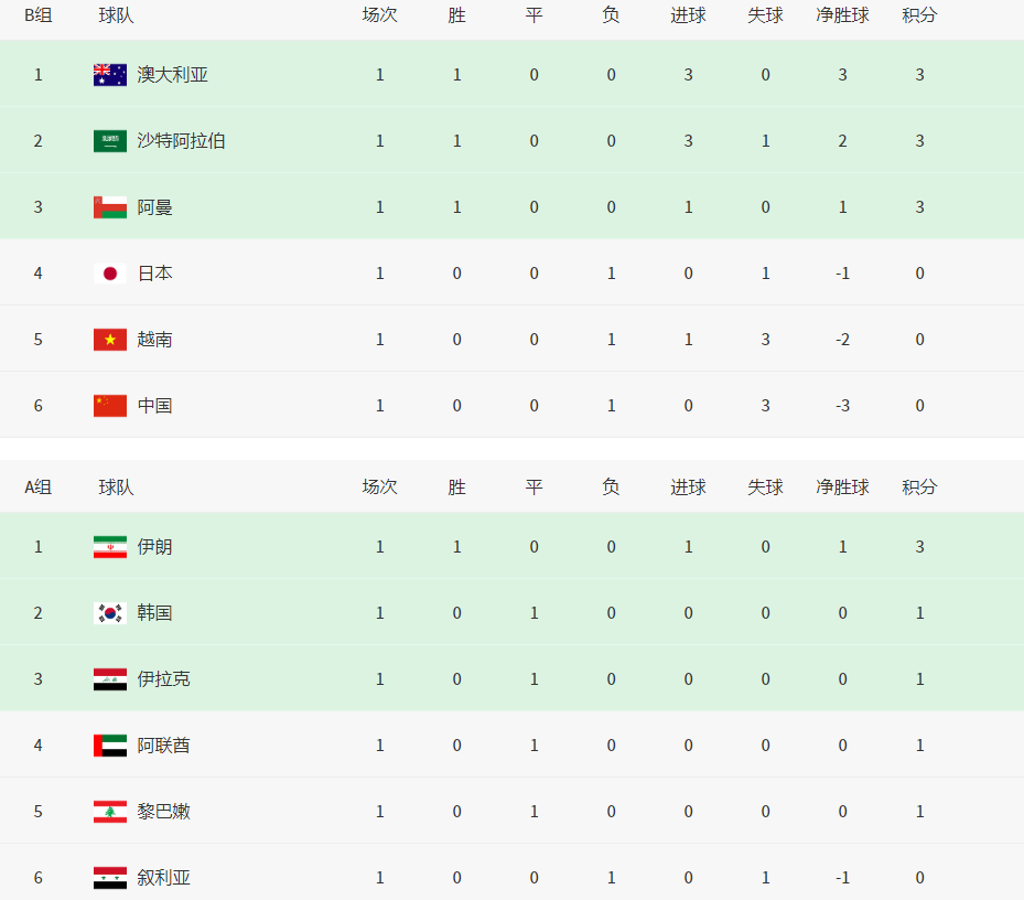 B组方面,首先是日本爆出了超级冷门,主场0-1不敌第5档次球队阿曼。这一场比赛,瞬间让A组的局势大乱。随后进行国足比赛,国足在开场20分钟占据一定优势的情况下,突然开始崩盘,最终0-3完败。最后进行的沙特阿拉伯和越南的比赛,最终沙特3-1取胜,拿到了令人信服的胜利。