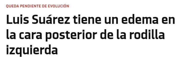 马竞官方表示,苏亚雷斯在对阵比利亚雷亚尔的比赛中出现膝盖不适,随后被换下。赛后经过检查得出结果,球员左膝出现水肿。