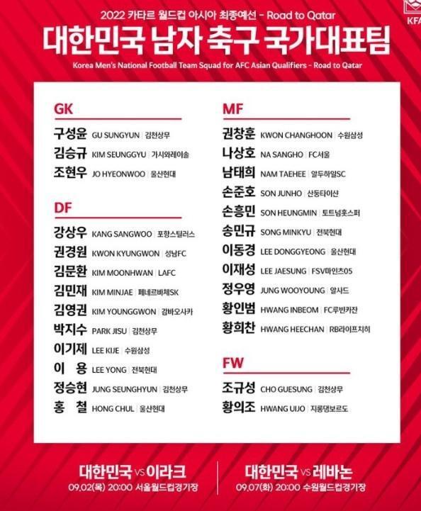 JRS直播网讯 韩国国家队今日公布了9月份12强赛的大名单,由孙兴慜领衔。