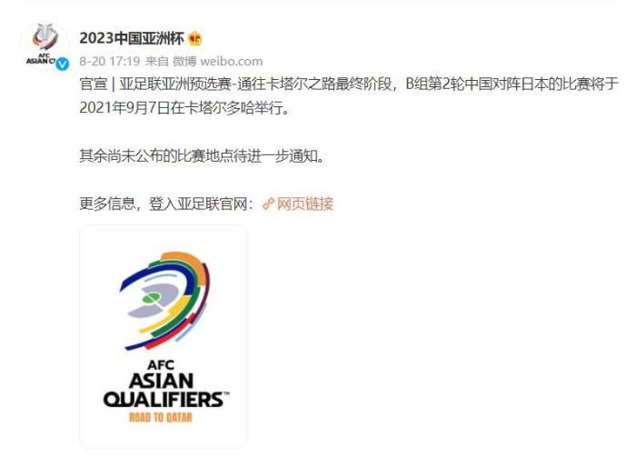 JRS直播网讯 今日,亚足联官宣,B组第2轮中国对阵日本的比赛将于2021年9月7日在卡塔尔多哈举行。