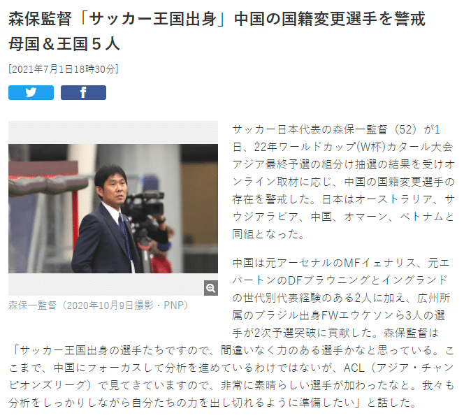 JRS直播网讯 日本主帅森保一日前接受了媒体采访,他表示中国的几位归化球员来自足球王国,所以实力非常强大。