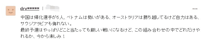 日本网友对小组赛还是保持谨慎,他们认为除了中国,澳大利亚、沙特和越南都不能轻视,小组赛将很艰难。