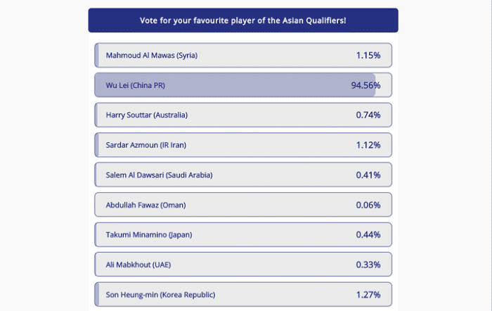 而根据官网的投票数据显示,武磊的得票率已经高达94.56%,属于是碾压级别的。剩下的8名球员中,得票数最高的是孙兴慜,这位目前亚洲头号球星在本月出战2场180分钟,贡献1球1助攻的数据,但是得票率也仅仅是1.27%而已,和武磊相比,差距巨大。
