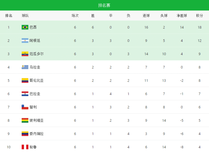 JRS直播网讯 北京时间6月9日,世预赛南美区第8轮结束了争夺,值得一提的是世预赛南美区的第5和第6轮都延期,所以截止到目前,各队都是打了6场比赛。其中巴西队保持全胜,稳居榜首,阿根廷队遭遇绝平,巴拉圭的输球也让本轮拿到1分的乌拉圭重返前四,接下来我们一起看看世预赛南美区最新排名: