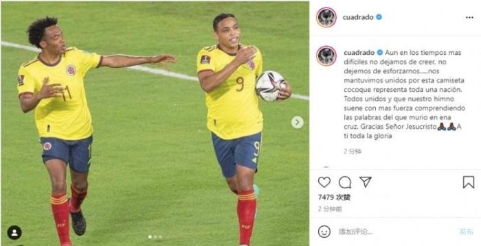 赛后夸德拉多更新INS:“即便在最困难的时候,我们也不会放弃信念,我们不会停止尝试进球。我们通过身穿这件球衣团结在一起,这代表了整个国家。所有人团结在一起,我们的声音听起来更加响亮了,感谢基督耶稣!”