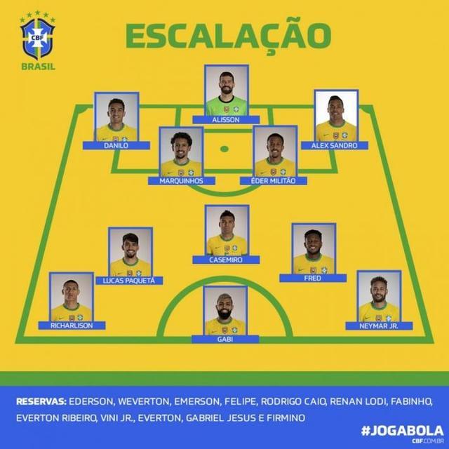 巴西首发:阿利森、达尼洛、马尔基尼奥斯、米利唐、桑德罗、卡塞米罗、帕奎塔、弗雷德、理查利森、内马尔、巴尔博萨