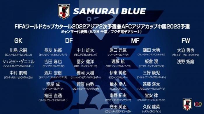 中场:原口元气(汉诺威96)、远藤航(斯图加特)、伊东纯也(亨克)、桥本拳人(罗斯托夫)、南野拓实(南安普顿)、守田英正(圣克拉拉)、板仓滉(格罗宁根)、镰田大地(法兰克福)、三好康儿(安特卫普)、远藤溪太(柏林联)、堂安律(比勒菲尔德)、久保建英(赫塔费)