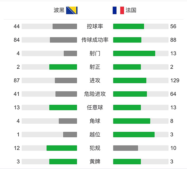 第58分钟,法国做出换人调整,吉鲁换下科曼。比赛第61分钟,法国首开记录!拉比奥特前场左路传中,格列兹曼小禁区头球抢点破门,波黑0-1法国。
