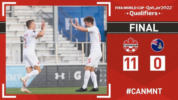 加拿大整场比赛踢得相当顺风,上半场就6-0领先对手,下半场他们再进5球,最终11-0大胜开曼群岛。