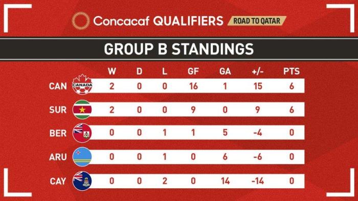 加拿大目前在世界杯中北美洲预选赛B组两战两胜,打进了16球,丢1球,以净胜球优势力压苏里南排名第一。
