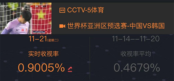 除了网络上热议之外,这场国足0-3不敌韩国队的比赛也创造国足最近的收视率新高,根据数据显示,这场比赛的收视率巅峰时刻接近1%,联想到是在晚上的黄金时段,这样的成绩已经很优秀了。