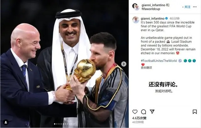因凡蒂诺在个人社媒写道:“自2022年卡塔尔世界杯决赛这场世间罕有的足球盛宴结束以来,已经过去了500天。两队在卢塞尔体育场献上了一场精彩绝伦的比赛,让现场观众和在屏幕前的数以亿计的足球迷们大饱眼福。