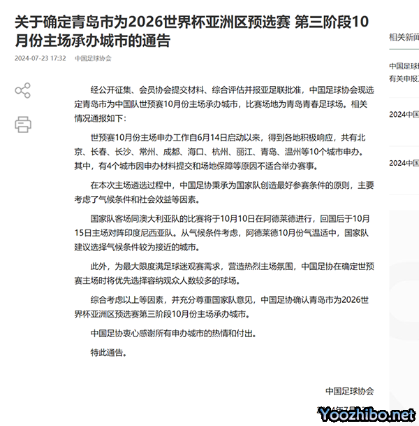 足协在公告中透露,共有北京、长春、长沙、常州、成都、海口、杭州、丽江、青岛、温州共计10个城市,申办18强赛10月份主场与印尼的比赛,但其中有4座城市因申办材料提交和场地保障等原因,不适合举办赛事。最终足协在剩余6座城市中,选定了青岛市。