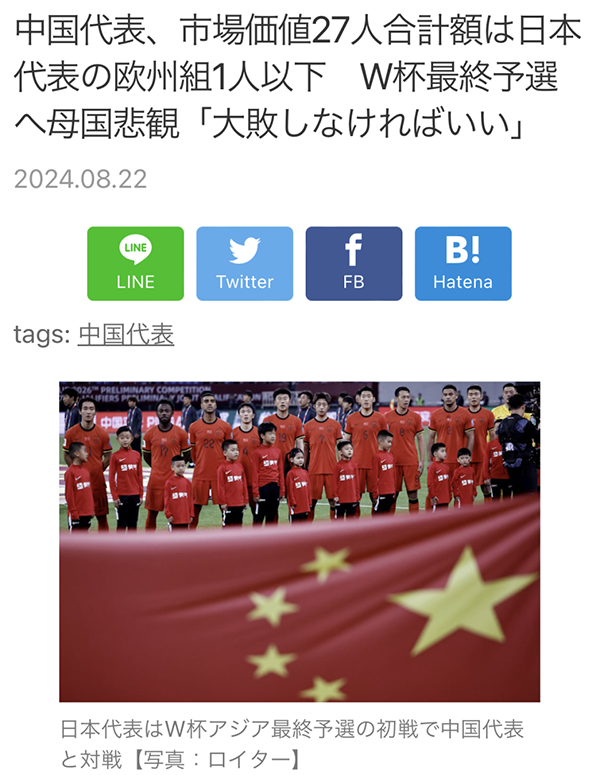 JRS直播网讯 中国男足征战18强赛前2轮的国脚名单已经公布,而作为国足18强赛的第1个对手,日本媒体自然也对此相当关注,不过在日媒看来,中国男足似乎毫无威胁。北京时间8月22日,知名日媒就以《中国队27人全队身价甚至不及日本旅欧球员1人》为题,评价了国足18强赛的阵容。
