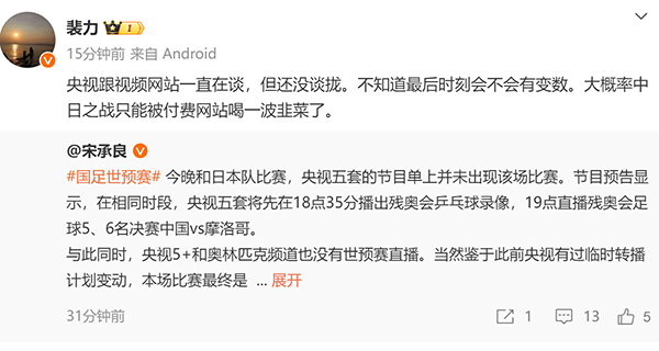 这场比赛目前没有央视转播的信息,但记者裴力表示:央视跟视频网站一直在谈,但还没谈拢。不知道最后时刻会不会有变数。