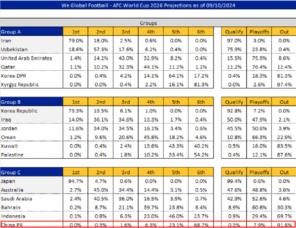 JRS直播网讯 北京时间9月12日,权威数据网站We Global Football更新了18强赛各队的出线概率。尽管才进行了2轮,但在开局2连败后中国男足出线概率仅剩下0.3%,形势已经十分严峻。