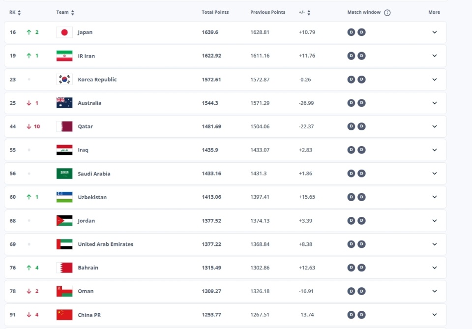 其他亚洲国家方面,日本凭借18强赛开局2连胜,狂轰12球丢0球的强势表现,已经升至世界第16位,伊朗位居第19位,韩国则排名第23位。