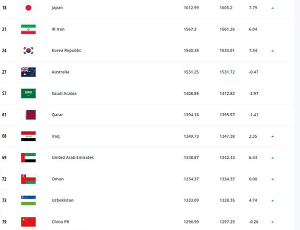2场比赛1胜1负的结果让中国男足跌了0.26个积分,来到世界第79位。目前亚洲排名前10位的依然是日本(18)、伊朗(21)、韩国(24)、澳大利亚(27)、沙特(57)、卡塔尔(61)、伊拉克(68)、阿联酋(69)、阿曼(72)和乌兹别克斯坦(73)。中国男足距离乌兹别克斯坦还有36的巨大分差,短期内要想跻身亚洲前10位,难度颇大。