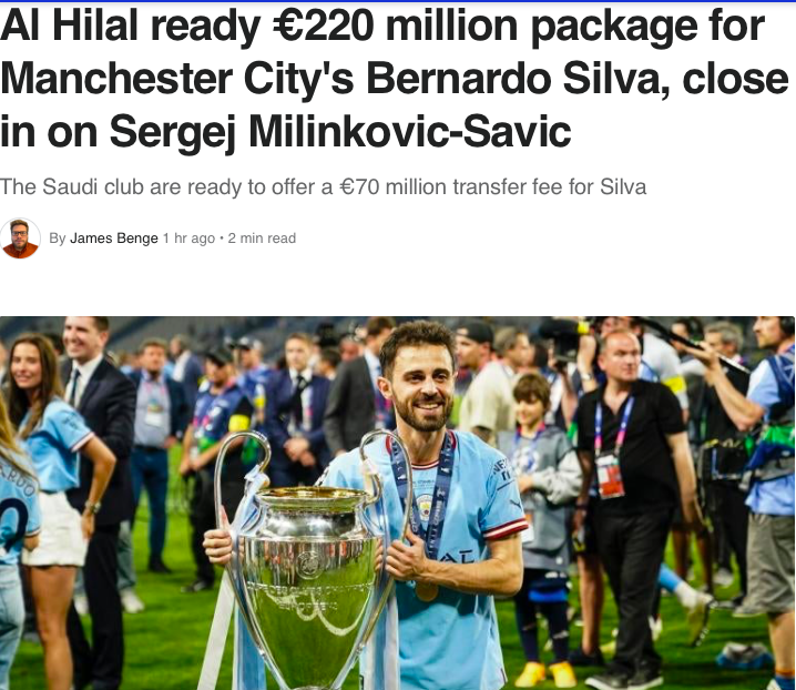 而为了说服B席加盟。利雅得新月准备为他提供5000万欧元的年薪,这一薪酬方案甚至远远超过了曼城付给他的薪水。不仅如此,新月还将为B席向曼城送上7000万欧元的报价,这甚至比曼城6年前从摩纳哥引进B席的转会费还要高出2000万欧元。可以说,沙特豪门的报价已经相当有诚意。而葡萄牙中场在过去的一个月里,一直在考虑来自利雅得新月的报价。