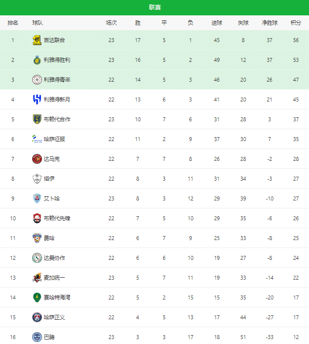 JRS直播网04月10日讯 ,沙特联第23轮继续进行,利雅得胜利0-0闷平费哈,C罗没有能够延续进球的势头。同时榜首的吉达联合以2-1击败麦加统一,利雅得胜利依旧位居第二名,落后吉达联合3分。接下来我们一起来看看沙特联赛最新排名: