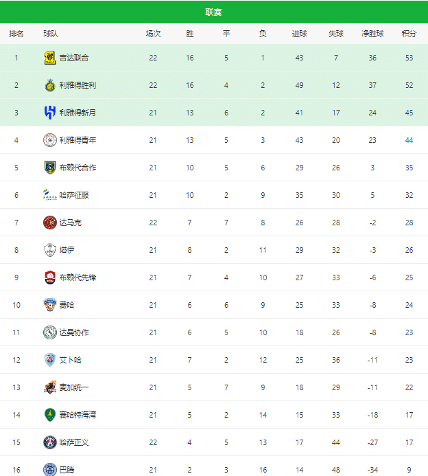 此前因为参加亚冠也世俱杯而缺席多场比赛的利雅得新月也追了上来,他们相比起吉达联合和利雅得胜利来说少赛一场,目前积45分,虽然处于落后的位置,但依旧有希望逆转翻盘。