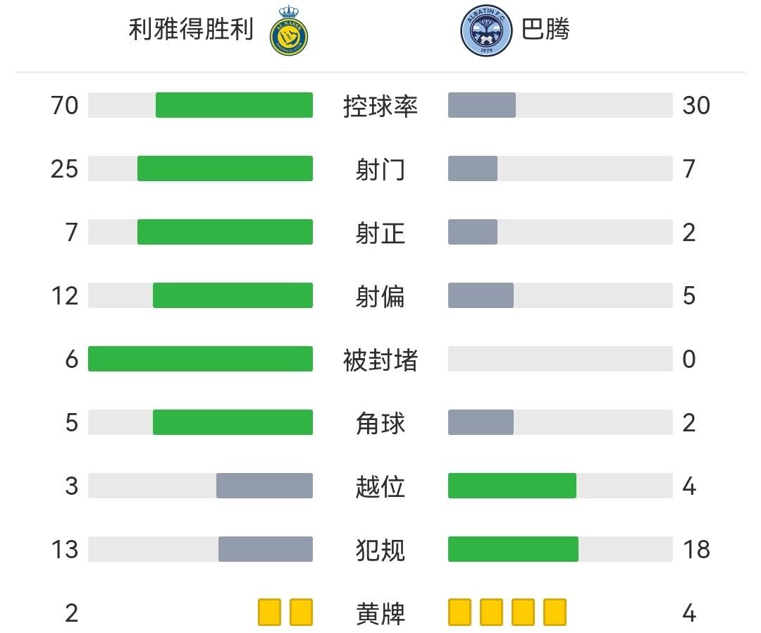 利雅得胜利3-1巴腾 C罗空门遭门线解围