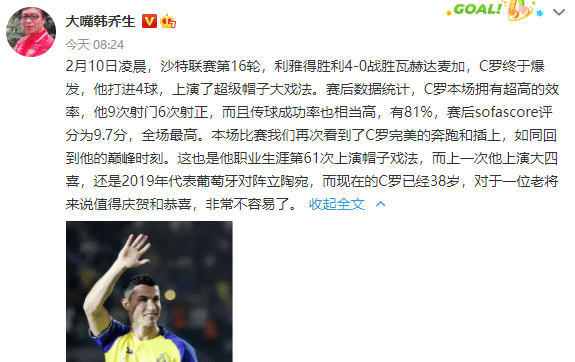 要知道C罗在利雅得胜利的起步并不是很好,首战虽然赢球,但C罗没有破门,进球的是锋线搭档塔利斯卡,第二场比赛是国内杯赛,结果C罗所在的利雅得胜利很遗憾输球,被淘汰出局。C罗开局续两场比赛都没有进球,外界对于他的质疑声四起。终于在最近两场联赛中,C罗连续进球,两战轰下5球,单场比赛的上演大四喜好戏,率队稳居第一。