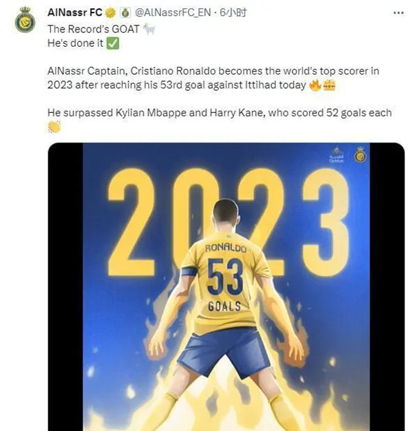 利雅得胜利发文盛赞C罗表现:“纪录的GOAT!他做到了。利雅得胜利队长,克里斯蒂亚诺-罗纳尔多今天打进了他的第53球,成为2023年世界最佳射手。他超越了打进52球的姆巴佩和凯恩。”