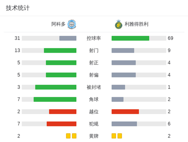 关键事件: 第6分钟,利雅得胜利首开记录!哈桑禁区回做弧顶B罗一脚世界波破门,阿科多0-1利雅得胜利。↓