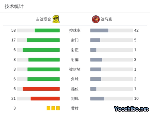 关键事件: 第38分钟,吉达联合首开记录!哈吉中路弧顶精准斜塞给到若塔单刀推射破门,吉达联合1-0达马克。