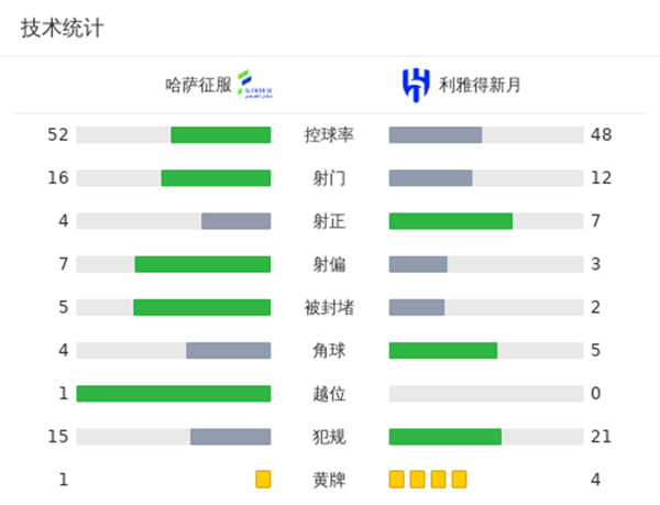 全场比赛结束,利雅得新月客场2-0击败哈萨征服。
