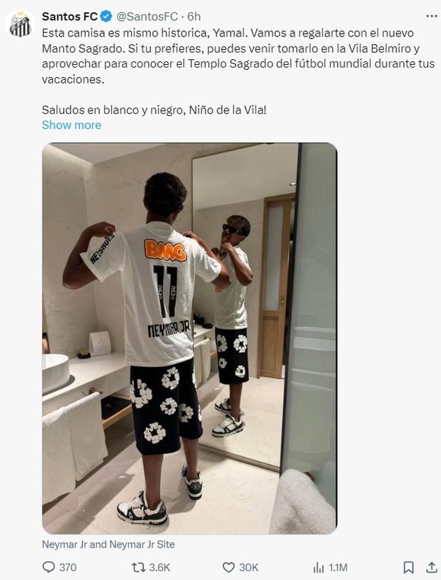 桑托斯官方表示道:“这件球衣很有历史意义,亚马尔,我们想要给你一件新的球衣。如果你愿意,可以趁着假期来到维拉贝尔米罗体育场,并借此机会参观世界足球点的圣殿。