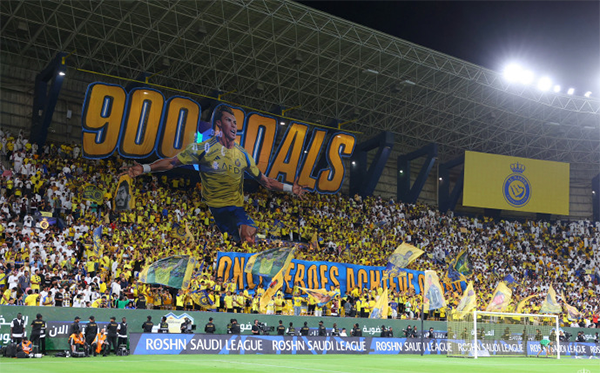 利雅得胜利官方向C罗赠送了一件纪念他在职业生涯中打进900球的球衣,球衣上印有“GOAT(史上最佳)”和“900个进球”等字样。而现场的利雅得胜利球迷,则在主场看台展现了一幅巨型TIFO,致敬这位葡萄牙巨星。