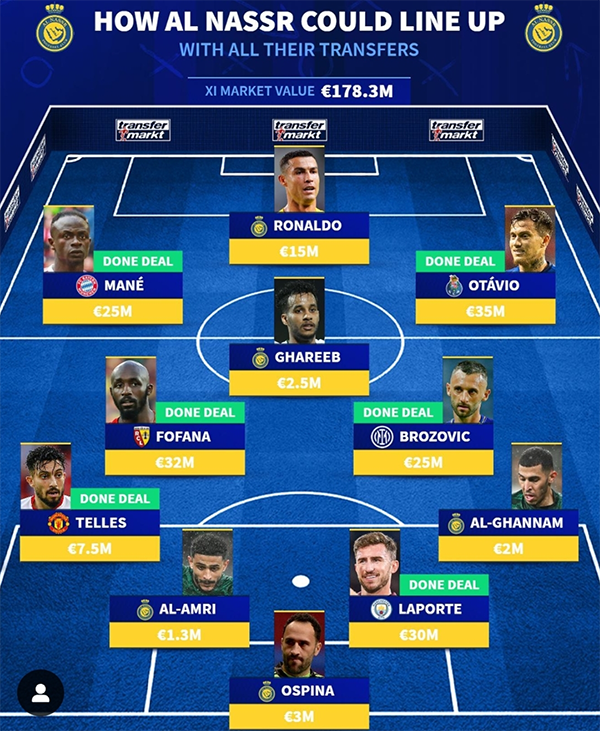 当然利雅得胜利的整体实力还是很强的,在拿下拉波尔特之后,球队补充了后防线,使得阵容攻守平衡。奥斯皮纳担任门将、后防线上有前曼联球员特莱斯、前曼城球员拉波尔特,中场由前国米球员布罗佐维奇领衔,前锋线的三人组是马内、C罗、奥塔维奥,还有塔利斯卡等人。