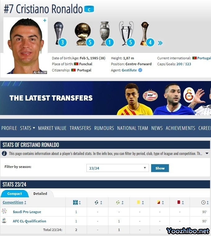 JRS直播网08月24日讯,德国《转会市场》更新了网站内的部分信息,值得注意的是,德转已经将葡萄牙巨星C罗,此前夺得的阿拉冠奖杯和6场6球的数据去除。这也意味着C罗这个阿拉冠奖杯和金靴,都没有得到权媒认可。