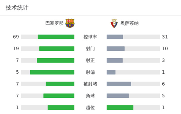 最终全场比赛结束,巴萨2-0奥萨苏纳。