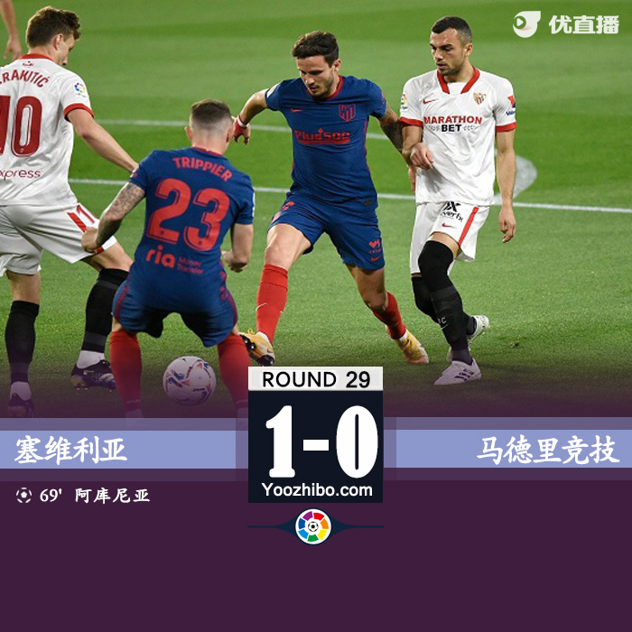 JRS直播网讯 4月5日讯 北京时间04月05日星期一03:00,西甲第29轮塞维利亚迎战马德里竞技。上半场拉基蒂奇造点,奥布拉克扑点,马竞半场0-0塞维利亚。下半场,阿库尼亚首开记录。最终,塞维利亚主场1-0力克马竞。在同轮次情况下,马竞的领先优势仅剩3分。