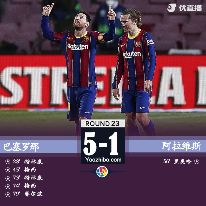 JRS直播网2月14日讯 北京时间2月14日04:00,西甲第23轮继续进行,巴塞罗那主场迎战阿拉维斯。上半场,莫里巴助攻特林康破门帮巴萨取得领先,梅西世界波扩大比分。下半场,里奥哈利用莫里巴的传球失误扳回一球,特林康和梅西连入两球锁定胜局,菲尔波锦上添花。最终,巴塞罗那5-1大胜阿拉维斯,取得七连胜升至第2位。