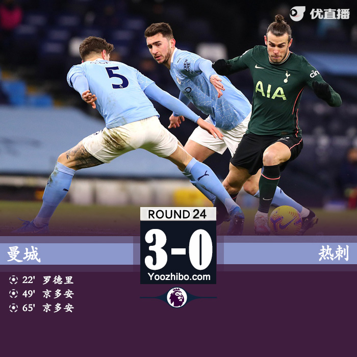 JRS直播网2月14日讯 北京时间2月14日凌晨1点30分,2020-21赛季英超第24轮的焦点战在伊蒂哈德球场展开角逐,曼城坐镇主场迎战热刺。上半场凯恩任意球中框,罗德里点射打破僵局,下半场京多安梅开二度后伤退,埃德森献助攻。最终曼城主场3-0完胜热刺,蓝月亮豪取各项赛事16连胜,热刺近6场输掉5场。积分榜方面,曼城积53分继续领跑,热刺积36分位居第8名。