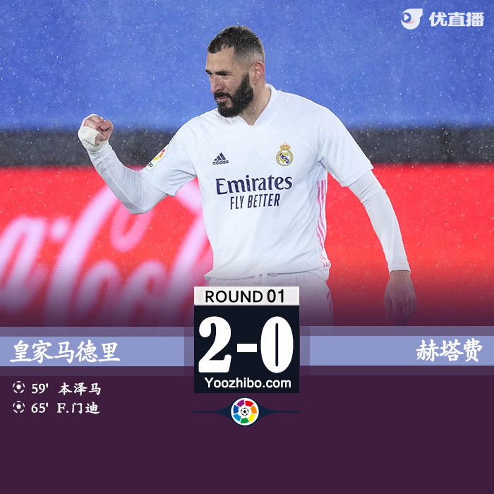 JRS直播网2月10日讯 西甲第一轮补赛,皇马主场迎战赫塔费,本泽马、门迪破门,维尼修斯、马塞洛献助攻,皇马2-0击败赫塔费升至第二,多赛2场仍落后榜首马竞5分。