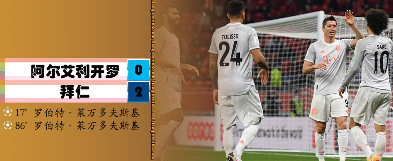 JRS直播网2月9日讯北京时间今天2:00,世俱杯半决赛拜仁迎战开罗国民的比赛准时开始。上半场莱万推射打开局面,半场拜仁一球领先。下半场回来拜仁依旧控制局面,终场前萨内助攻莱万再下一城,全场结束拜仁2-0击败开罗国民晋级世俱杯决赛。决赛中,拜仁将对阵墨西哥老虎大学队。