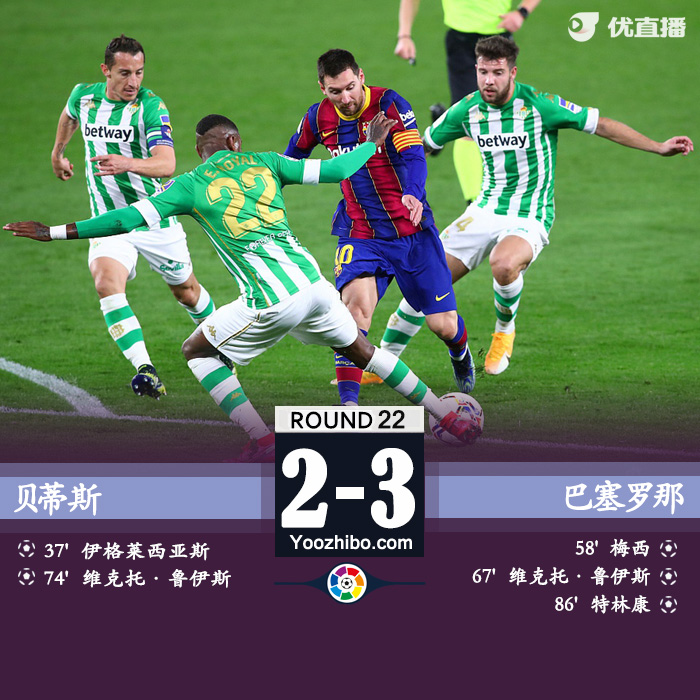 JRS直播网2月8日讯 北京时间今天4:00,西甲第22轮巴萨客场挑战贝蒂斯。上半场伊格莱西亚斯为皇家贝蒂斯打开局面,下半场回来梅西替补登场三分钟后进球扳平,格子造乌龙反超,鲁伊斯乌龙后头球攻门扳平,特林康终场前远射制胜。全场比赛结束,巴萨做客3-2逆转贝蒂斯,收获联赛6连胜升至第二。
