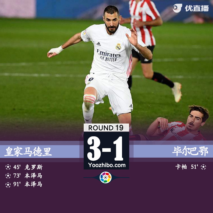此后双方再无建树,最终皇马3-1击败毕巴取胜。
