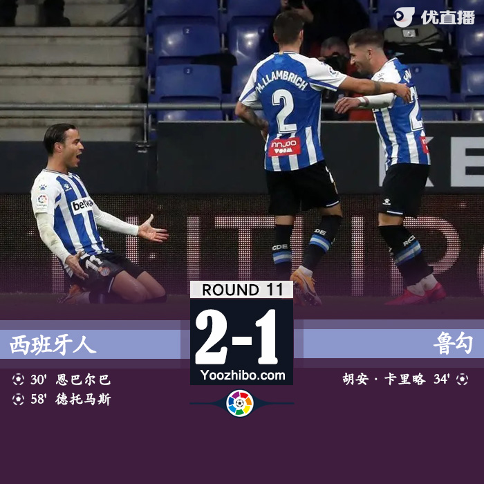 JRS直播网讯:北京时间11月8日4时(西班牙当地时间7日21时),西乙第11轮开始1场较量,西班牙人主场2比1击败卢戈,以4分优势领跑。武磊连续2轮担任替补,第90分钟替补出场。恩巴尔巴传射,德托马斯连续3轮破门。
