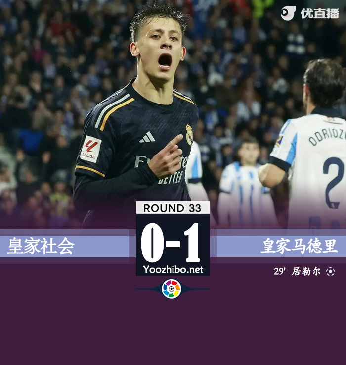 JRS直播网讯:北京时间4月27日,西甲第33轮,皇马客场挑战皇家社会。上半场,卡瓦哈尔精妙助攻19岁居勒尔打进赛季第二球,久保健英进球被VAR取消。易边再战,奥亚萨瓦尔越位进球被吹。最终皇家社会0-1皇家马德里。积分榜方面,皇马27轮不败先赛14分领跑,皇家社会51分第六。