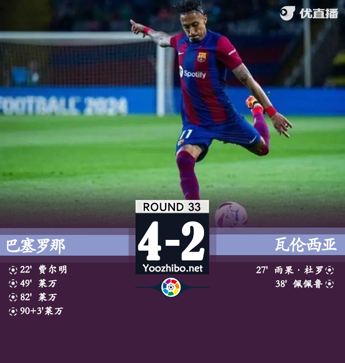 JRS直播网讯:北京时间3:00西甲第33轮,巴塞罗那主场迎战瓦伦西亚。上半场,费尔明首开记录;特尔施特根挑球过人玩砸送空门;阿劳霍送点;瓦伦门将停球失误+禁区外手球遭罚下,半场巴萨暂时1-2落后。下半场,莱万两次角球中头球梅开二度!比赛最后阶段又任意球直接破门完成帽子戏法!最终,巴萨4-2击败十人瓦伦升至第二,落后榜首11分。