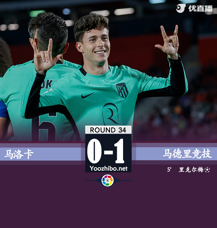 JRS直播网讯:北京时间5月5日凌晨3时,西甲第34轮,马竞客场对阵马洛卡。上半场,里克尔梅首开纪录。马竞半场1-0领先马洛卡。下半场双方均无建树。最终马竞客场1-0击败马洛卡,取得联赛两连胜。本轮战罢,马竞继续排名西甲第四,领先第五名6分。