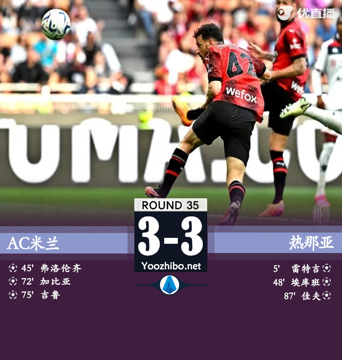 JRS直播网讯:北京时间5月6日0:00,意甲第35轮AC米兰主场迎战热那亚。上半场,托莫里开场3分钟送点,雷特吉点射帮助热那亚领先;普利西奇兜射中柱;弗洛伦齐半场读秒阶段扳平比分。下半场,埃库班头球帮助热那亚再次领先;丘库埃泽破门但越位无效;加比亚头球帮助米兰再度扳平,吉鲁失良机后打入反超进球;佳夫最后时刻乌龙!最终AC米兰主场3-3热那亚,联赛4轮不胜。